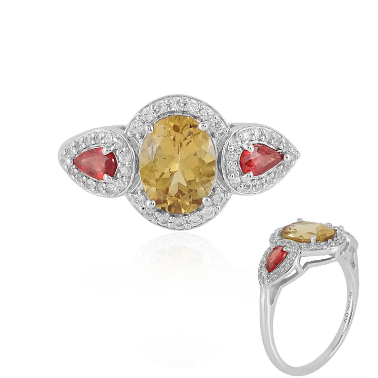 Dieser exquisite Ring besteht aus einem brasilianischen gelben Beryll im Ovalschliff, der von zwei tropfenförmigen Twilight-Saphiren aus Tansania flankiert wird. Alle Steine sind in glänzendes platiniertes 925er Sterling Silber gefasst. Der Beryll, der durch seine warmen Gelbtöne besticht, strahlt mit 1,524 Karat in voller Pracht, während die roten Saphire mit ihrem Gesamtgewicht von 0,484 Karat einen dramatischen Kontrast bilden. Weitere Akzente setzen 44 kambodschanische Zirkone im Rundschliff, die der Komposition insgesamt 0,329 Karat Glanz verleihen. Dieses Schmuckstück ist perfekt geeignet, um einen Abendlook zu vervollständigen oder einen Hauch von Raffinesse in Ihr tägliches Outfit zu bringen.