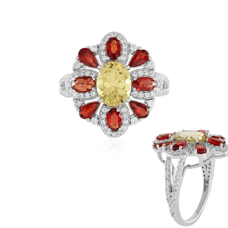 Dieser lebhafte Ring zeigt einen schillernden gelben Beryll im Ovalschliff von 1,468 Karat aus Brasilien, der inmitten einer feurigen Korona aus tansanischen Rubinen gefasst ist. Der zentrale Edelstein wird von 4 Rubinen im Oval- und 4 im Tropfenschliff mit einem Gesamtgewicht von 1,877 ct umrahmt und von einem Halo aus 90 kambodschanischen Zirkonen mit einem Gesamtgewicht von 0,804 ct akzentuiert. Das Ganze ist in platiniertes 925er Sterlingsilber gefasst. Das Spiel aus warmen und kühlen Farben macht diesen Ring zu einem vielseitigen Accessoire, das sowohl zu einem legeren Outfit als auch zu einem Ensemble für besondere Anlässe passt.