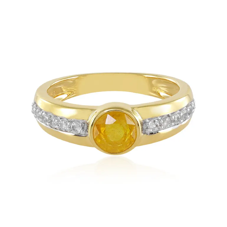 Entdecken Sie das sonnige Strahlen dieses exquisiten Rings, dessen Herzstück ein atemberaubender gelber Saphir aus Madagaskar von 0,585 ct. mit einem Rundschliff von ca. 5 mm ist. Flankiert wird der zentrale Edelstein von funkelnden Zirkonen aus Kambodscha mit einem Gesamtgewicht von 0,194 ct, die die Brillanz des Rings noch verstärken. Der Ring ist aus hochwertigem 925er Sterlingsilber mit einer aufwendigen Goldplattierung gefertigt und wiegt etwa 2,23 g. Er ist eine prächtige Ergänzung zu jedem Ensemble, ideal, um Ihren Tageslook zu verschönern oder der Abendgarderobe einen Hauch von Glamour zu verleihen.
