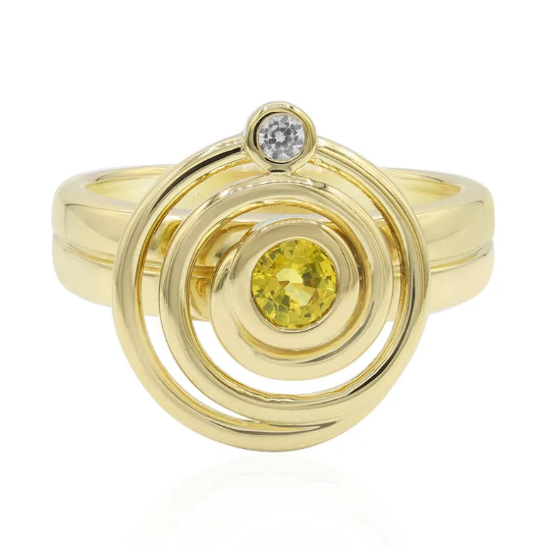 Entdecken Sie die sonnige Ausstrahlung dieses atemberaubenden Rings mit gelbem Saphir aus der MONOSONO COLLECTION. Der 0,28-karätige Saphir aus Madagaskar leuchtet in vergoldetem 925er Sterlingsilber mit einladender Wärme. Ergänzt durch einen funkelnden Zirkon von 0,04 Karat aus Kambodscha, zaubert dieser Ring eine Geschichte von Eleganz und Anmut an Ihren Finger. Das konzentrische Kreisdesign verleiht jedem Ensemble eine moderne Note und macht ihn zu einer vielseitigen Ergänzung Ihres Schmuckkästchens. Perfekt, um Ihrer Bürokleidung einen Hauch von Farbe zu verleihen, oder als Statement-Stück für einen Abend.