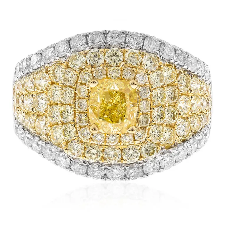 Entdecken Sie die Faszination dieses exquisiten Rings von CIRARI, dessen Herzstück ein gelber Diamant im Antik-Schliff von 1,01 ct. und Reinheit SI2 ist. Umgeben von einem luxuriösen Pflaster aus 34 weißen und 70 gelben SI2-Diamanten mit einem Gesamtgewicht von 2,385 Karat ist dieses Schmuckstück eine wahre Schatztruhe voller Glanz. Die atemberaubende Kreation aus 18 Karat Gelb- und Weißgold wiegt ca. 6,39 g und hat eine Größe von 25 x 21 mm. Dieser Ring eignet sich perfekt für Galaveranstaltungen oder als vornehme Ergänzung zu jedem anspruchsvollen Outfit und verspricht, das Highlight Ihrer Schmucksammlung zu werden.