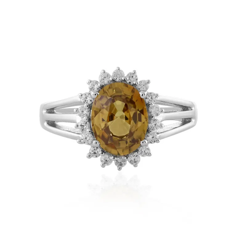 Entdecken Sie das sonnige Funkeln dieses tansanischen gelben Zirkon-Silberrings, der mit einem 2,828-karätigen Ovalschliff in der Mitte glänzt. Umgeben von einem Halo aus 0,389 Karat kambodschanischen Zirkon-Akzenten, glänzt dieser Ring aus 925er Sterlingsilber mit brillantem Glanz. Die subtilen Gelbtöne, die von den funkelnden Steinen umschlossen werden, machen diesen Ring zu einer exquisiten Ergänzung für jedes Ensemble, perfekt für die Eleganz am Tag oder den Glamour in der Nacht. Mit einem Gesamtkaratgewicht von 3,217 Karat ist dieses Stück ebenso beeindruckend wie bezaubernd.