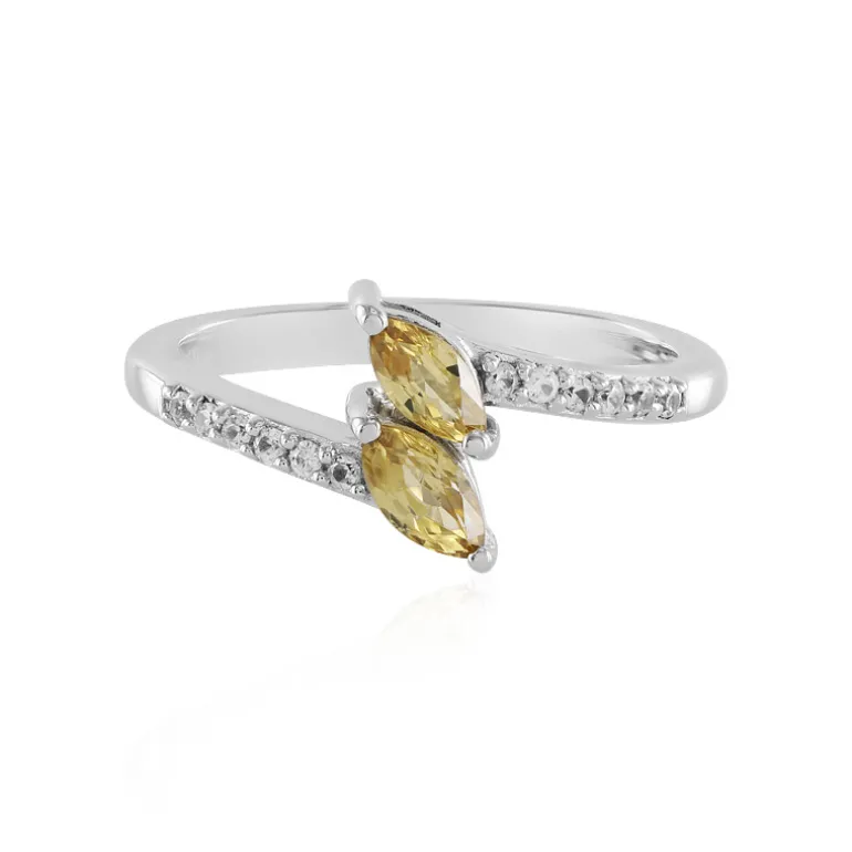 Dieser atemberaubende Ring präsentiert die verführerische Schönheit eines gelben Zirkons im Marquise-Schliff aus Tansania mit einem Gesamtgewicht von 0,627 Karat, ergänzt durch funkelnde Zirkon-Akzente im Rundschliff aus Kambodscha in einer eleganten Fassung aus platiniertem 925er Sterling Silber. Das offene Banddesign mit einem Gesamtgewicht von 0,77 Karat verleiht dem Schmuckstück eine moderne Eleganz, die nahtlos vom Tag zum Abend übergeht. Dieses Schmuckstück passt perfekt zu einer weißen Bluse oder einem kleinen schwarzen Kleid und ist ein Muss für jede Schmuckliebhaberin.