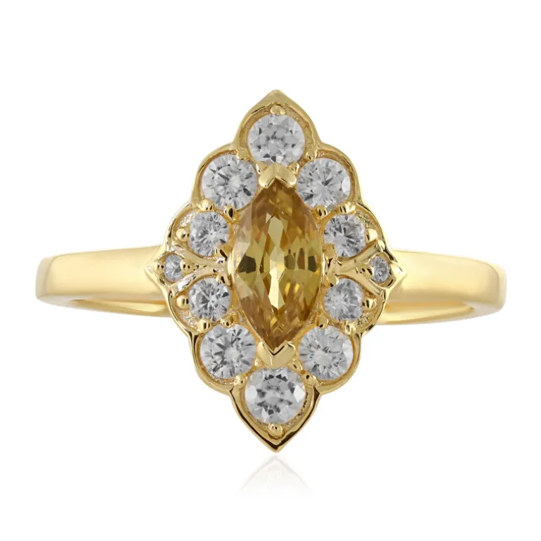 Schmücken Sie Ihren Finger mit der Wärme der Sonne, die in diesem Ring aus vergoldetem 925er Sterlingsilber eingefangen ist. Der strahlende gelbe Zirkon im Marquiseschliff (0,838 ct) aus Tansania wird von schimmernden Zirkonakzenten aus Kambodscha (1,718 ct) flankiert. Der auffällige Kontrast zwischen dem goldenen Farbton und den funkelnden Seitensteinen sorgt für einen dramatischen Effekt, der sowohl Ihre Abendgarderobe als auch Ihre Alltagskleidung aufwertet. Ein Accessoire, das in Ehren gehalten werden soll.