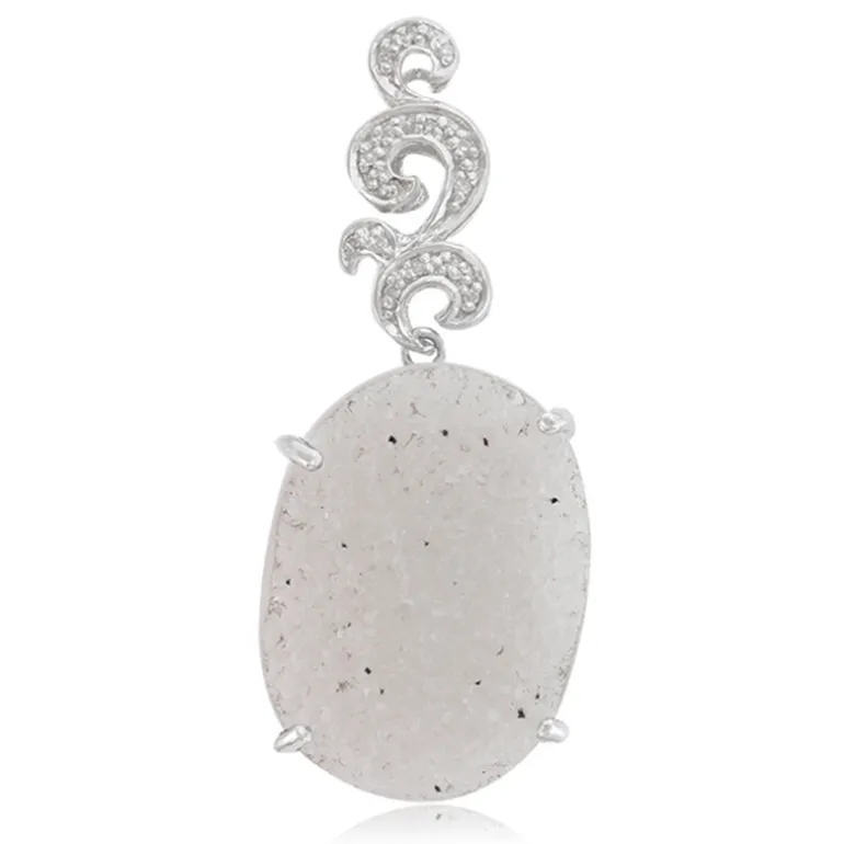 Entdecken Sie die Faszination dieses brasilianischen Glitzerachat-Anhängers, bei dem funkelnde Eleganz auf zeitloses Design trifft. Der zentrale Stein hat einen großzügigen ovalen Cabochon-Schliff von 25,35 Karat und wird von elegantem 925er Sterlingsilber gehalten. Der Anhänger ist mit 15 Miniaturdiamanten von insgesamt 0,04 Karat besetzt und besticht durch seinen subtilen Schimmer und sein unglaubliches Lichtspiel. Mit seinen Maßen von 42×17 mm ist er ein idealer Blickfang für gesellschaftliche Anlässe oder ein raffinierter Akzent für die Bürogarderobe. Kombinieren Sie ihn mit einer Silberkette und lassen Sie dieses bezaubernde Stück Ihren Stil aufwerten.
