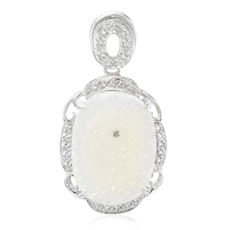 Entdecken Sie die bezaubernde Anziehungskraft dieses Anhängers aus 925er Sterlingsilber, der mit einem 27,77 Karat schweren brasilianischen Achat besetzt ist, der ein fesselndes Funkeln ausstrahlt. Der ovale Cabochon-Schliff schafft eine glatte, gewölbte Oberfläche, die den schimmernden Effekt des Steins maximiert. Der Achat ist von 28 brasilianischen Weißtopasen mit einem Gesamtgewicht von 0,17 Karat umgeben, die einen himmlischen Heiligenschein ausstrahlen. Mit seinen Maßen von 42×23 mm ist dieser Anhänger vielseitig einsetzbar, ob in der Freizeit oder bei Abendveranstaltungen. Er passt zu jeder Kleidung und ist ein tadelloses Geschenk oder eine wertvolle Ergänzung zu Ihrer persönlichen Sammlung.