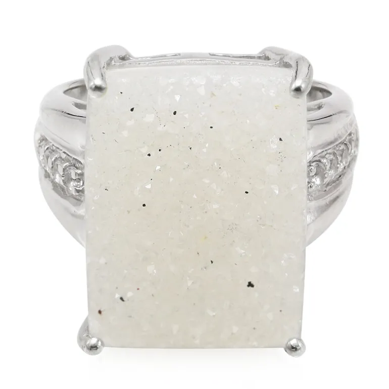 Erleben Sie die Anziehungskraft dieses bezaubernden Rings aus 925er Sterlingsilber mit einem opulenten brasilianischen Glitzer-Achat von 16,95 Karat. Der antike Achat im Cabochon-Schliff mit den beeindruckenden Maßen von 19 x 14,5 mm funkelt in kristallinem Glanz, perfekt umrahmt von acht brillanten runden weißen Topasen. Dieses bezaubernde Schmuckstück schafft ein harmonisches Gleichgewicht zwischen klassischem Charme und moderner Eleganz und ist damit ein ideales Accessoire für eine elegante Abendveranstaltung oder ein Statement für den Alltag.