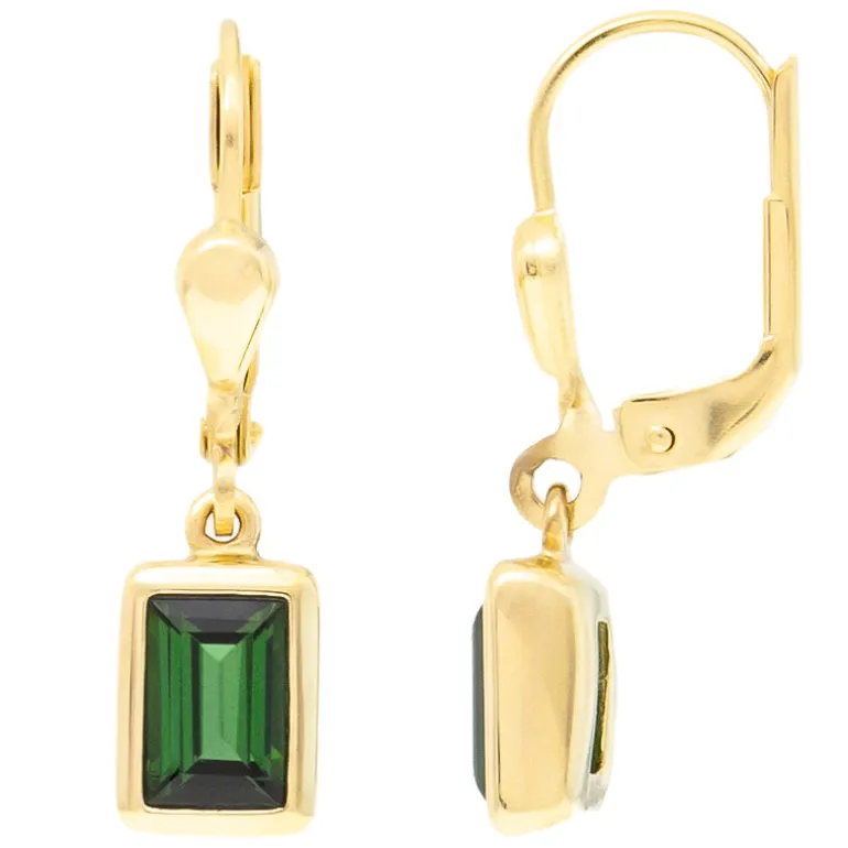 Diese eleganten Golconda Turmalin-Ohrringe mit je einem 1-karätigen Edelstein aus den üppigen Regionen Brasiliens sind ein echter Blickfang. Die fachmännisch in schlanke Baguettes geschliffenen und in 375er Gelbgold gefassten Ohrringe wiegen ca. 2,02 g und haben eine Länge von 23 mm. Diese Ohrringe eignen sich sowohl für formelle Anlässe als auch für den Alltag und sorgen für Gesprächsstoff. Kombinieren Sie sie mit einem passenden grünen Ensemble oder heben Sie sie von neutralen Tönen ab.