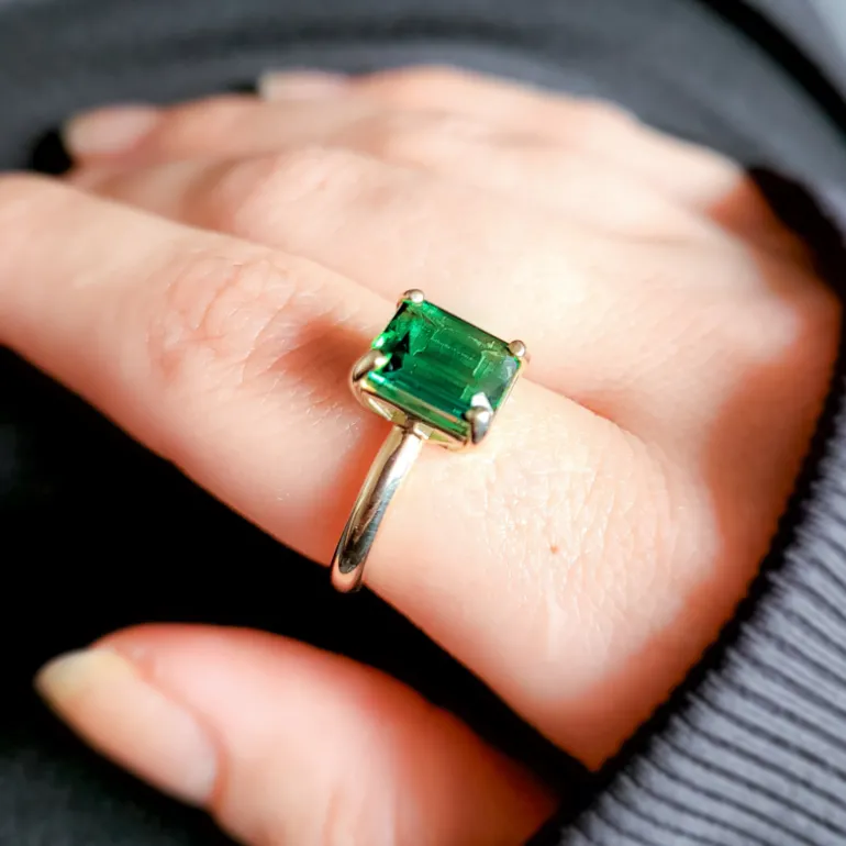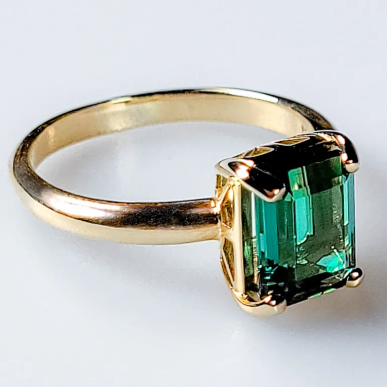 Entdecken Sie die zeitlose Anmut dieses Rings mit Golconda-Turmalin aus Brasilien. Der 2,1-karätige Edelstein im exquisiten Achteck-Stufenschliff ist in 375er Gelbgold eingebettet und wiegt etwa 3,37 g. Der leuchtende Grünton des Turmalins wird durch die warmen Goldtöne hervorgehoben. Der Ring eignet sich perfekt für elegante Anlässe oder als raffiniertes Accessoire für Ihr tägliches Outfit. Ob Sie nun ein Kenner oder ein Neuling in der Welt des feinen Schmucks sind, der Charme dieses Rings ist unbestreitbar.