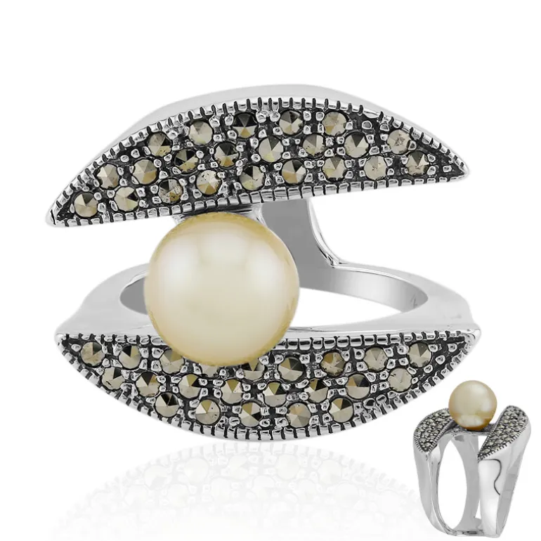 Goldener Südsee Kabira Perlen & Markasit Ring, 925 Silber