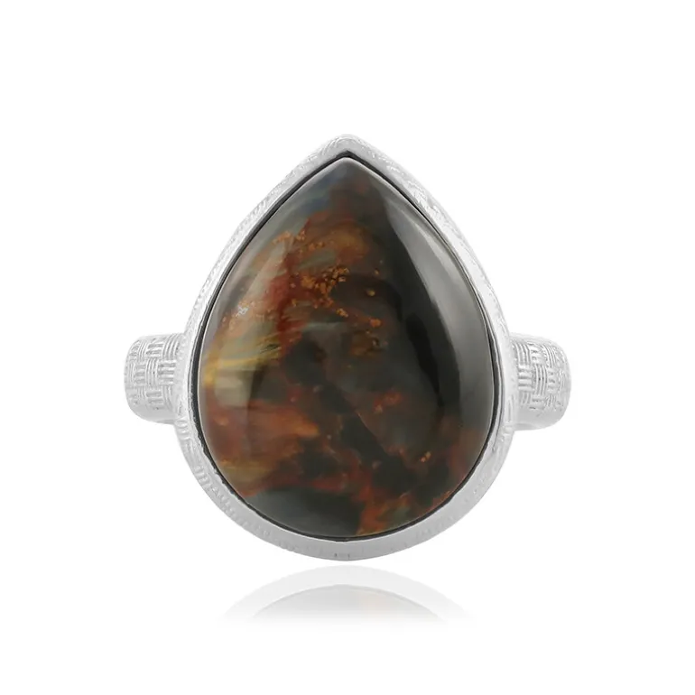Entdecken Sie den Zauber dieses namibischen Goldenen Pietersit Rings. Gefertigt aus hochwertigem 925er Sterlingsilber mit einem Gewicht von ca. 3,55 g, präsentiert er einen auffälligen 7,74 ct großen, tropfenförmigen Pietersit-Cabochon-Edelstein. Der 17x13mm große Stein strahlt in satten, erdigen Farbtönen und ist damit eine hervorragende Ergänzung für jede Schmucksammlung. Dieser Ring ist ideal, um Ihrer Garderobe einen Hauch von Raffinesse zu verleihen, und eignet sich sowohl für legere Ausflüge als auch für formelle Anlässe.