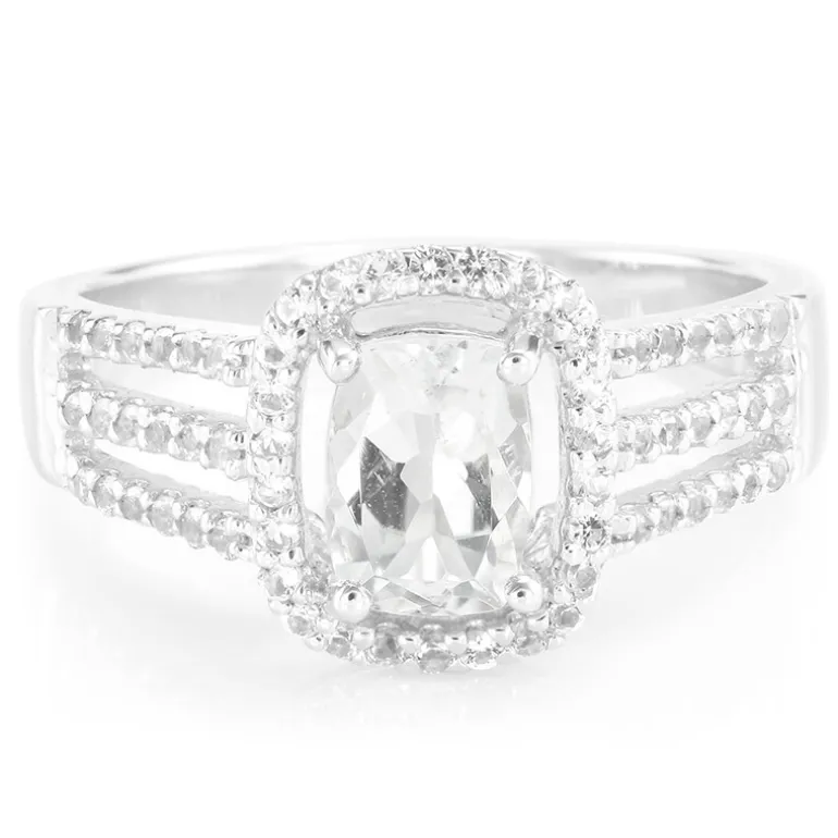 Lassen Sie sich von der subtilen Eleganz dieses brasilianischen Goshenit-Rings verzaubern. Der 0,74 ct große Mittelstein im Antikschliff verstärkt seine Brillanz. Das aus 925er Sterlingsilber gefertigte Band ist mit 62 funkelnden weißen Topasen von insgesamt 0,337 ct. verziert, die für zusätzlichen Reiz sorgen. Das zeitlose Design dieses Rings eignet sich perfekt für den Übergang vom Tag zum Abend und setzt sowohl in Kombination mit legeren Ensembles als auch mit raffinierter Abendgarderobe ein Zeichen. Das Gesamtgewicht der Edelsteine von 1,077 ct sorgt dafür, dass jedes Tragen ein Ausdruck von Luxus und Anmut ist.