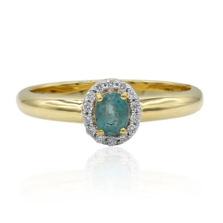 Entdecken Sie die zarte Anziehungskraft dieses Rings von AMAYANI mit einem seltenen Grandidierit aus Madagaskar von 0,3 Karat, der von einem Halo aus funkelnden Diamanten von 0,063 Karat umgeben ist. Dieser ovale Edelstein sitzt majestätisch in einer Fassung aus 18 Karat Gelbgold und wiegt ca. 3,38 g. Der Ring präsentiert sich in einem üppigen blaugrünen Farbton, der von Brillanz umgeben ist und ihn zu einer luxuriösen Ergänzung für jedes Ensemble macht. Dieses Schmuckstück ist ideal für besondere Anlässe und verleiht Ihrer Kleidung einen Hauch von Raffinesse und Eleganz.