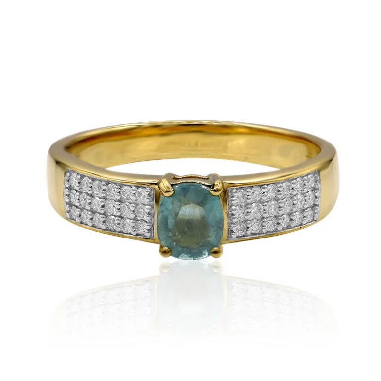 Entdecken Sie den Luxus mit diesem exquisiten Ring aus 18 Karat Gelbgold, der einen Madagaskar Grandidierit im Ovalschliff von 0,46 Karat enthält. Verkrustet mit 0,162 ct schimmernden runden Diamanten im Brillantschliff, strahlt dieses Stück Eleganz aus. Das 5,16 g schwere Goldband unterstreicht den Reiz dieses Rings, der sich perfekt für besondere Anlässe oder als wertvolles Geschenk eignet.