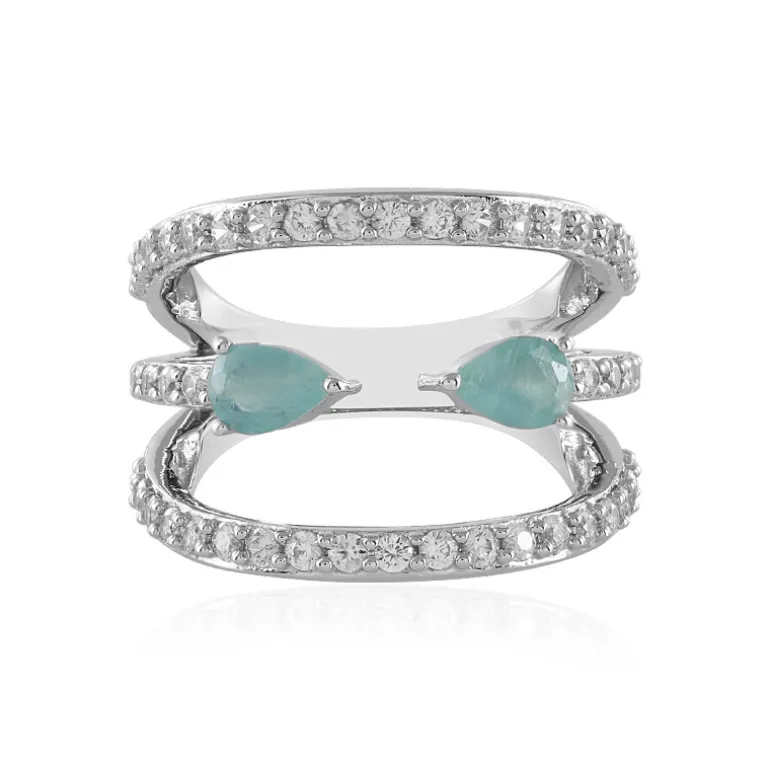 Entdecken Sie die Faszination des seltenen Grandidierit mit diesem auffälligen Ring aus Sterlingsilber, der zwei Grandidierit-Edelsteine aus Madagaskar mit einem Gesamtgewicht von 0,679 ct in einem einzigartigen Tropfenschliff enthält. Umgeben von 48 kambodschanischen Zirkonen im Rundschliff funkelt dieses Schmuckstück mit einem Gesamtgewicht von 2,23ct. Das moderne, offene Design dieses platinierten Schmuckstücks macht es zu einem vielseitigen Accessoire, das sowohl tagsüber als auch abends getragen werden kann. Ideal für alle, die seltene Edelsteine mit einem Hauch von Eleganz schätzen.