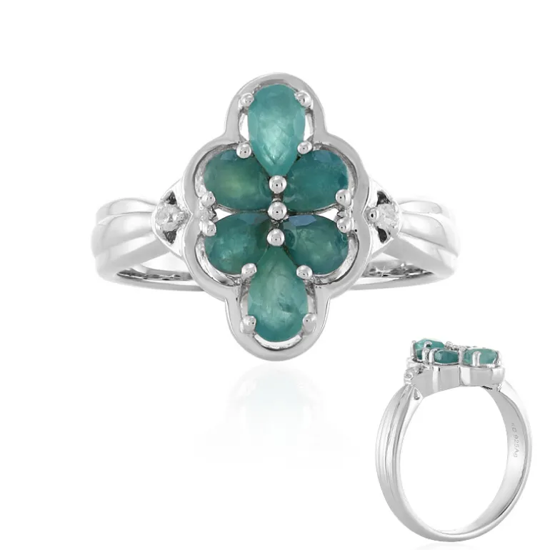 Dieses atemberaubende Schmuckstück besteht aus einer Symphonie von sechs tropfenförmigen Grandidierit-Edelsteinen aus Madagaskar, die von glänzendem 925er Sterling Silber umhüllt sind. Der Ring ist in einem zarten floralen Muster gefasst und mit funkelnden kambodschanischen Zirkonen akzentuiert, die für einen Hauch von Brillanz sorgen. Mit einem Gesamtgewicht von ca. 1,19 Karat ist dieser Ring ein Statement des raffinierten Geschmacks. Er eignet sich perfekt, um einem raffinierten Abendoutfit einen Hauch von Farbe zu verleihen oder das tägliche Tragen mit seinem einzigartigen ästhetischen Charme aufzuwerten.