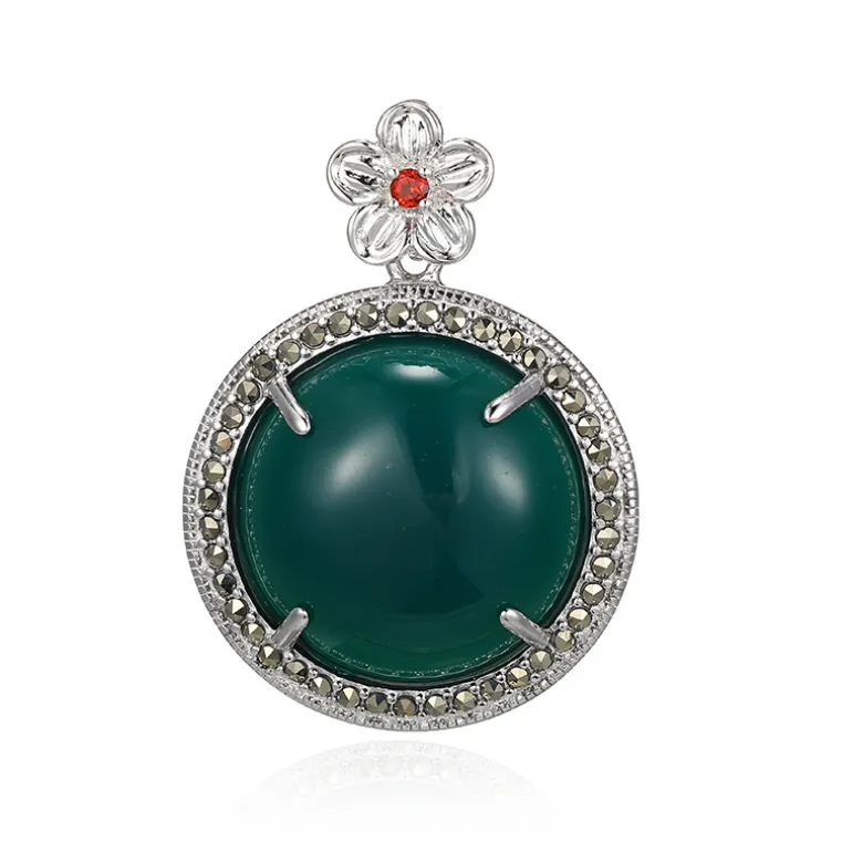Dieser bezaubernde Anhänger zeigt einen glänzenden Cabochon aus brasilianischem grünem Achat von 9,758 Karat, umringt von schimmernden Markasiten und gekrönt von einem strahlenden Granat aus Mosambik. Der in Sterlingsilber gefasste Anhänger zieht mit seinem leuchtenden Grünton und den funkelnden Akzenten die Blicke auf sich. Kombinieren Sie ihn mit Ihrem Lieblingskleid für einen eleganten Abend oder verleihen Sie Ihrer Freizeitkleidung einen Hauch von Raffinesse. Sein vielseitiges Design macht ihn für jede Gelegenheit geeignet.