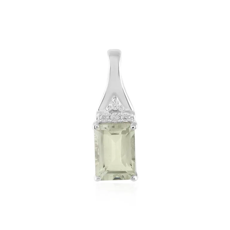 Dieser Anhänger aus Sterlingsilber mit einem grünen brasilianischen Amethyst bringt einen Hauch von natürlicher Ruhe ins Spiel. Der achteckige Stufenschliff des Edelsteins unterstreicht seinen üppigen, blattartigen Farbton und wird durch vier funkelnde Zirkone ergänzt. Mit einem Gesamtkaratgewicht von 0,982 Karat ist dieser Anhänger eine schöne Ergänzung für jede Sammlung. Er eignet sich sowohl für den Tag als auch für einen eleganten Abend und wird bei jeder Veranstaltung für Gesprächsstoff sorgen. Kombinieren Sie ihn mit einer Silberkette und vervollständigen Sie einen Look, der von raffiniertem Geschmack zeugt.