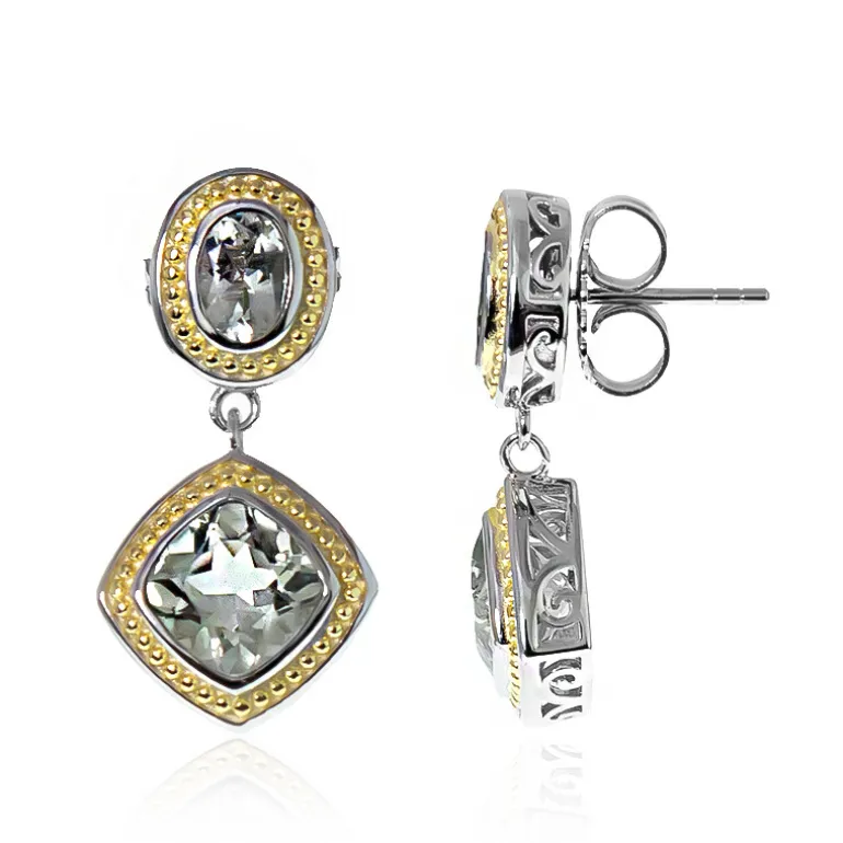 Lassen Sie sich von unseren brasilianischen grünen Amethyst-Ohrringen aus platiniertem 925er Sterling Silber verführen. Mit einem Gesamtgewicht von 5,076 ct präsentieren diese Ohrringe zwei grüne Amethyste im Kissenschliff (3,906 ct) und zwei ovale Edelsteine (1,17 ct), gefasst in einem atemberaubenden, antik inspirierten Design von Dallas Prince Designs. Mit ihrem satten Grünton strahlen diese Ohrringe einen eleganten Charme aus, der sowohl tagsüber als auch abends einen Hauch von Raffinesse verleiht. Peppen Sie Ihre Schmucksammlung mit diesem exquisiten Schmuckstück auf.