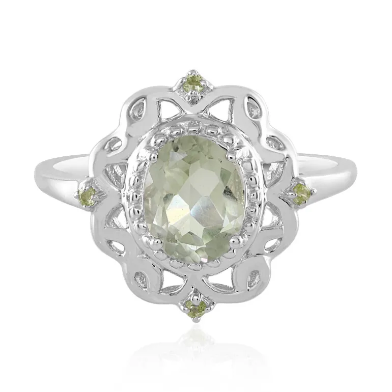 Entdecken Sie den Charme dieses exquisiten Rings mit einem brasilianischen grünen Amethysten, der in der Mitte einen ovalen Edelstein von 1,476 Karat aufweist, der elegant von filigranem Sterlingsilber umrahmt wird. Der Ring ist mit vier chinesischen Peridots im Rundschliff von insgesamt 0,072 ct besetzt und wiegt in seiner glänzenden 925er Silberfassung ca. 3,15 g. Dieser Ring mit seinen zarten Grüntönen eignet sich perfekt, um jedem Outfit einen Hauch von Frühlingsfrische zu verleihen, und kann im Alltag oder zu besonderen Anlässen getragen werden. Kombinieren Sie ihn mit Pastell- oder Erdtönen, um seine natürliche Schönheit zur Geltung zu bringen.