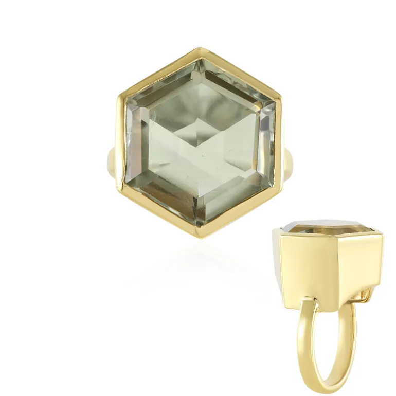 Dieser Ring aus vergoldetem 925er Sterlingsilber mit einem Hauch von geometrischer Eleganz enthält einen atemberaubenden grünen brasilianischen Amethysten mit 11,7 Karat. Der sechseckige Stufenschliff unterstreicht nicht nur den Reiz des Edelsteins, sondern bringt auch seine einzigartige Farbe zur Geltung. Dieser Ring ist ideal, um Ihrer Kleidung einen raffinierten Farbtupfer zu verleihen, und passt sowohl zu Alltagsoutfits als auch zu besonderen Anlässen. Sein großer Auftritt ist ein kühnes Statement und gleichzeitig anmutig und raffiniert.