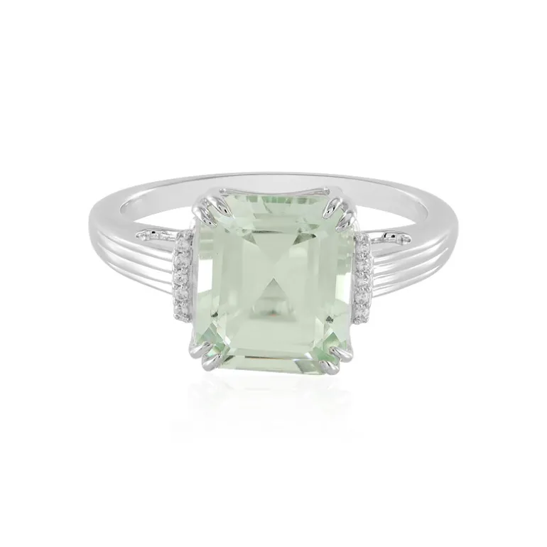 Entdecken Sie die Anziehungskraft dieses Rings mit brasilianischem grünem Amethyst, der aus einem wunderschönen 4,725 Karat schweren Edelstein im Oktagon-Stufenschliff besteht und in hochwertigem 925er Sterling Silber eingefasst ist. Verziert mit schillernden kambodschanischen Zirkon-Akzenten, strahlt dieses Stück Raffinesse aus. Es ist ideal, um Ihrem Ensemble einen Hauch von Eleganz zu verleihen und glänzt sowohl in legeren als auch in formellen Anlässen. Mit seinem modernen und doch zeitlosen Design wird dieser Ring den anspruchsvollen Schmuckliebhaber in seinen Bann ziehen.
