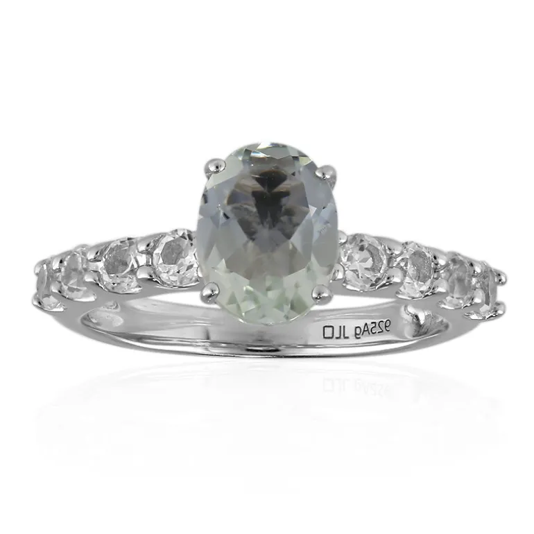 Entdecken Sie die Anziehungskraft dieses faszinierenden Rings mit einem 1,01 Karat großen brasilianischen grünen Amethysten, der in eine makellose ovale Form geschliffen ist und von 0,6 Karat weißen Topasen umrahmt wird. Das aus hochwertigem 925er Sterlingsilber gefertigte Schmuckstück strahlt eine Mischung aus Raffinesse und moderner Eleganz aus. Die dezenten Grüntöne und das schimmernde Silberband machen ihn zu einem vielseitigen Accessoire, das sich sowohl für den Alltag als auch für besondere Anlässe eignet. Dieser Ring passt perfekt zu einer weißen Bluse oder einem Abendkleid und ist eine zeitlose Ergänzung zu Ihrer Schmucksammlung.