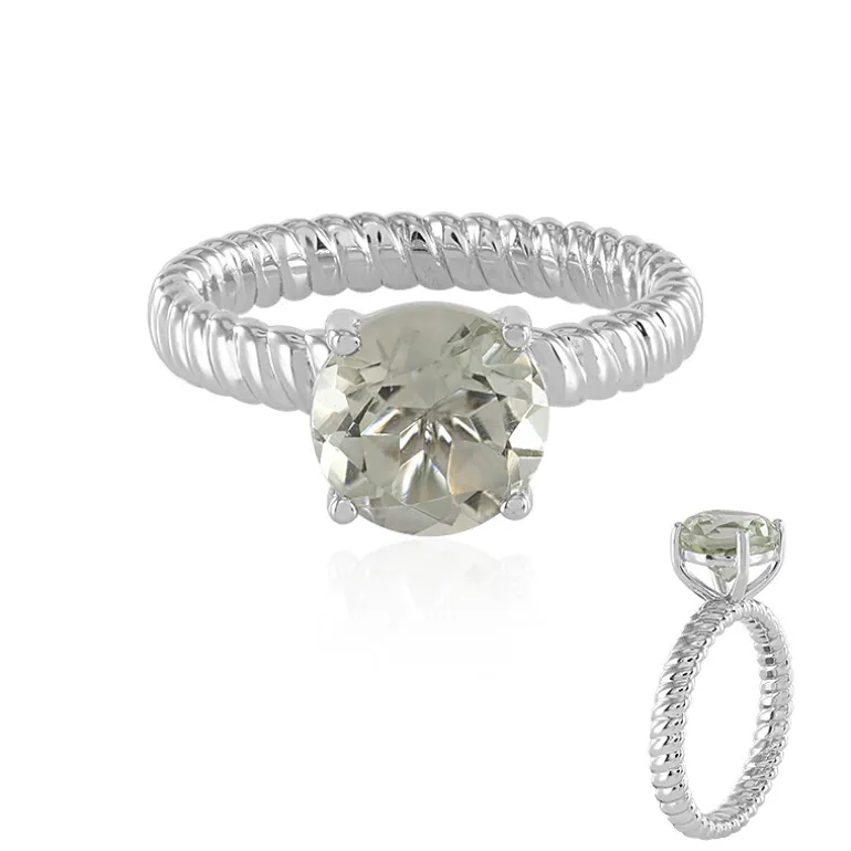 Entdecken Sie die subtile Eleganz dieses Rings mit einem brasilianischen grünen Amethysten. Der 1,55-karätige Stein im klassischen Rundschliff ist eingebettet in ein Band aus platiniertem 925er Sterlingsilber. Der wunderschön gearbeitete 26×20 mm große Ring besticht durch sein modernes Seildesign, das eine harmonische Mischung aus Tradition und zeitgenössischem Stil darstellt. Dieser Ring eignet sich perfekt, um jedem Outfit einen Hauch von Raffinesse zu verleihen, und kann nahtlos von einem Tag im Büro zu einem Abend in der Stadt übergehen. Sein vielseitiges Design sorgt dafür, dass er zu einem beliebten Schmuckstück in jeder Sammlung wird.