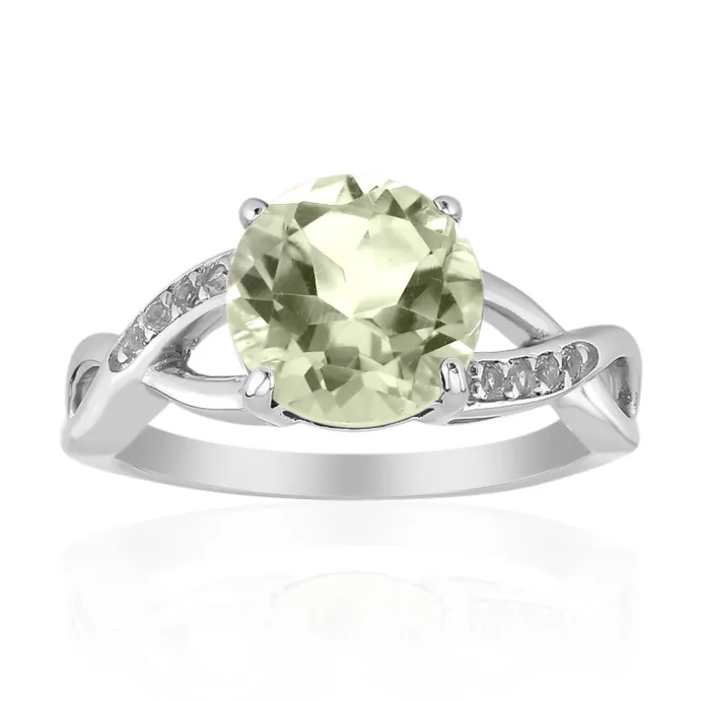 Entdecken Sie die erfrischende Anziehungskraft dieses Rings aus brasilianischem grünem Amethyst, der auf einem Band aus 925er Sterlingsilber mit polierter Oberfläche sitzt. Der zentrale Edelstein, ein grüner Amethyst im Rundschliff, hat beeindruckende 2,291 Karat und ist umgeben von acht funkelnden weißen Topasen aus Nigeria mit insgesamt 0,094 Karat. Das Design dieses Rings fängt die Essenz der Eleganz ein und verleiht jedem Outfit einen subtilen Hauch von Glamour, was ihn zu einer perfekten Wahl sowohl für zwanglose Brunches als auch für Abendveranstaltungen macht.