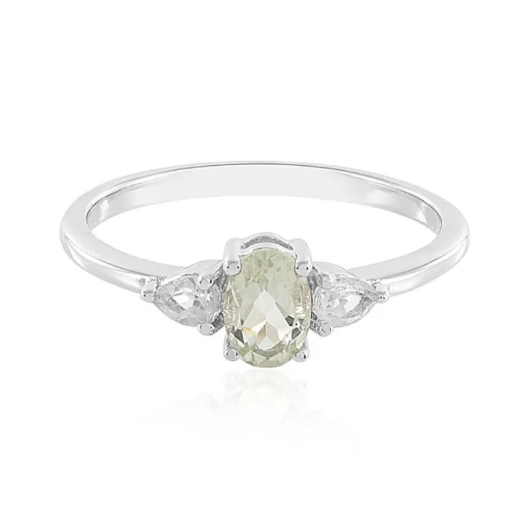 Entdecken Sie die Eleganz des brasilianischen grünen Amethyst-Silberrings. Dieses exquisite Schmuckstück präsentiert einen grünen Amethysten von 0,686 Karat im Ovalschliff, der elegant von zwei birnenförmigen weißen Topasen aus Madagaskar flankiert wird. Der Ring ist aus platiniertem 925er Sterlingsilber gefertigt und bietet einen zarten und doch raffinierten Look. Er eignet sich sowohl für legere als auch für formelle Anlässe und passt mit seinen dezenten Farbtönen zu jedem Outfit.
