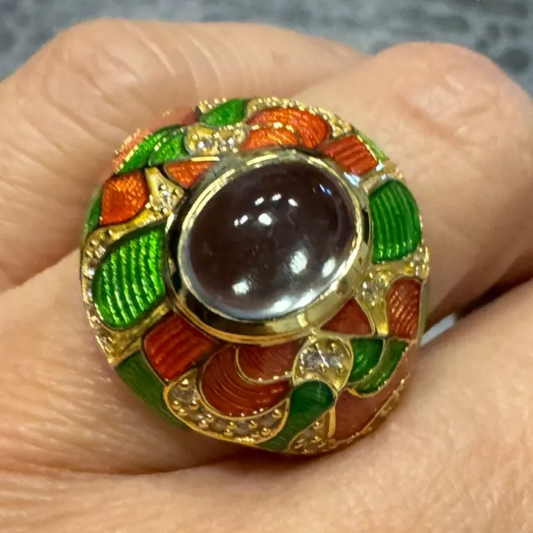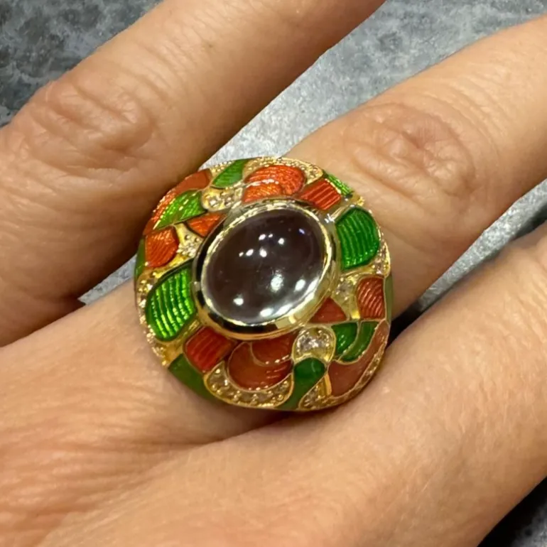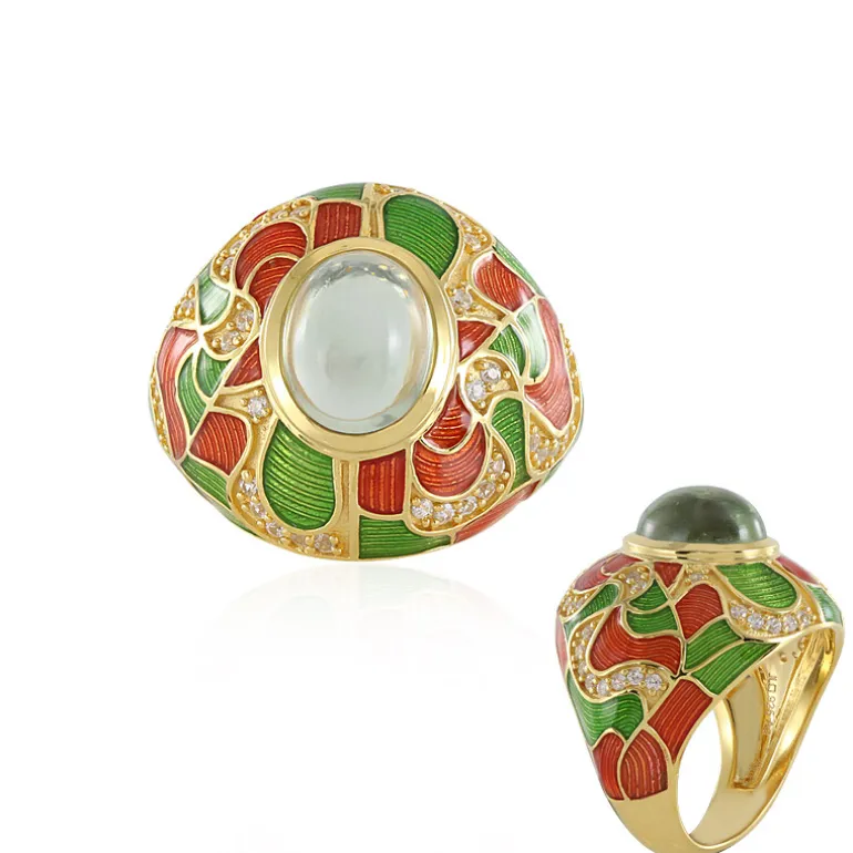 Entdecken Sie die Anziehungskraft dieses atemberaubenden Rings mit brasilianischem grünem Amethyst, der mit seinem großen ovalen Cabochon von 2,16 Karat ein wahrer Schatz ist. Eingebettet in 925 vergoldetes Sterling Silber, werden die leuchtenden Farben des Amethysten perfekt durch ein kompliziertes Ensemble von 42 funkelnden kambodschanischen Zirkonen von insgesamt 0,491ct ergänzt. Die kunstvolle Kombination aus grüner und roter Emaillierung erhöht die Attraktivität des Rings und macht ihn zu einem perfekten Accessoire sowohl für zwanglose Brunches als auch für formelle Galas. Sein einzigartiges Design ist eine Verbeugung vor der Pracht der Natur und ein Fest der anspruchsvollen Kunstfertigkeit.