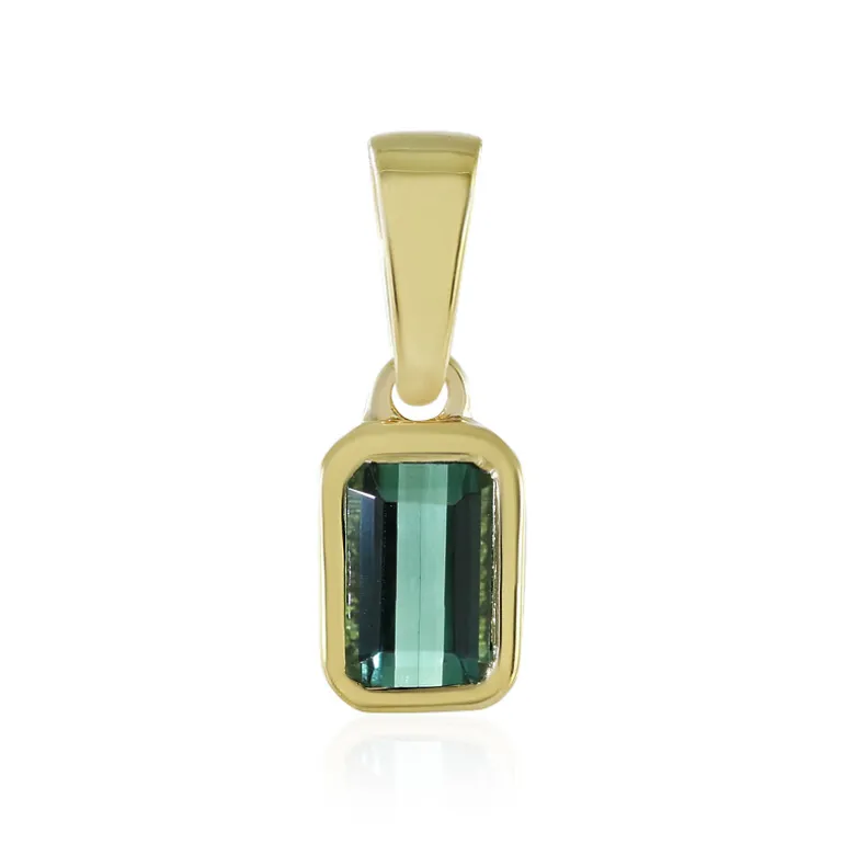 Dieser bezaubernde Anhänger besteht aus einem sattgrünen Benedito-Turmalin, der aus den üppigen Landschaften Brasiliens stammt. Der 0,496 Karat schwere Edelstein wurde fachmännisch in eine achteckige Stufenform geschliffen und misst etwa 6×4 mm. Der rund 0,67 g schwere Anhänger ist in 925er Sterlingsilber mit einer opulenten Goldplattierung gefasst und strahlt Raffinesse aus. Mit seinen Maßen von 15×5 mm ist er ein vielseitiges Accessoire, das sowohl der Tages- als auch der Abendgarderobe einen Hauch von Eleganz verleihen kann. Ideal für alle, die feine Handwerkskunst und den lebendigen Reiz einzigartiger Edelsteine zu schätzen wissen.