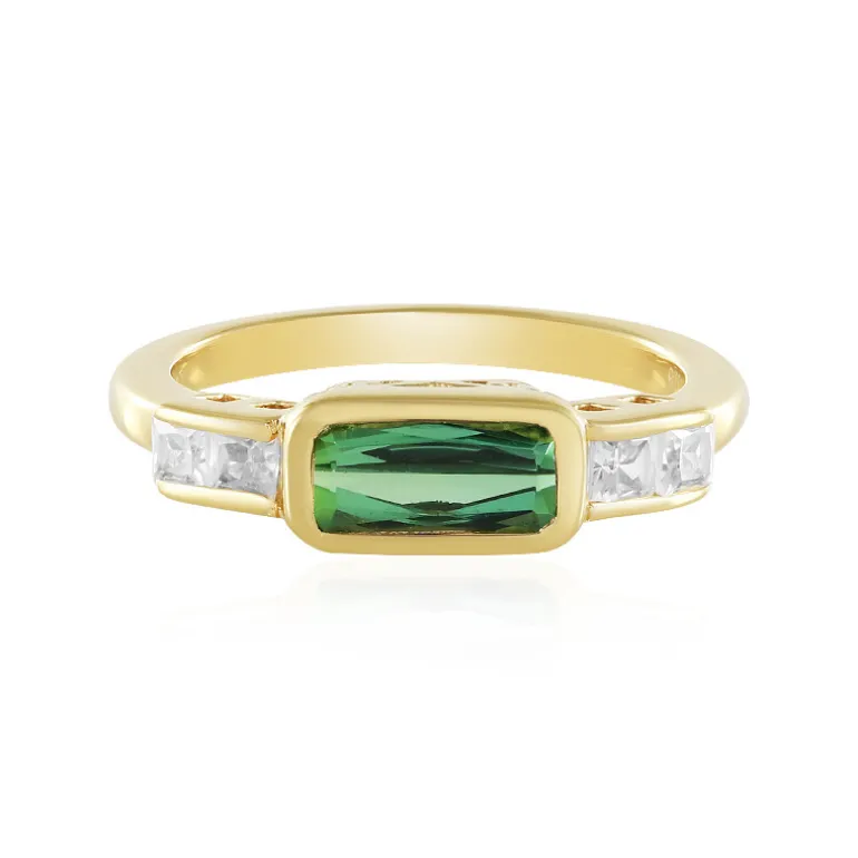 Entdecken Sie die Faszination dieses atemberaubenden Rings, der einen strahlenden brasilianischen grünen Turmalin mit einem Gesamtkaratgewicht von 1,191 ct präsentiert. Der bezaubernde Turmalin mit 0,718 Karat im achteckigen Strahlenschliff wird von 0,473 Karat funkelnden Zirkonen im quadratischen Prinzess-Schliff aus Kambodscha flankiert, die alle elegant in 2,54 g vergoldetes 925er Sterling Silber gefasst sind und ein luxuriöses Finish bieten. Perfekt für legere und formelle Kleidung, verspricht das anmutige Design, jedem Look einen Hauch von Raffinesse zu verleihen.