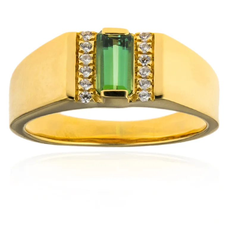 Entdecken Sie die Anziehungskraft dieses vergoldeten Rings aus Sterlingsilber, der einen auffälligen brasilianischen grünen Benedito-Turmalin mit einem einzigartigen achteckigen Stufenschliff präsentiert. Umgeben von funkelnden kambodschanischen Zirkon-Akzenten mit einem Gesamtgewicht von 0,114 ct ist dieser Ring mit 0,55 ct eine Symphonie aus Eleganz und Raffinesse. Der üppige grüne Farbton im Kontrast zu den warmen Goldtönen macht ihn zu einem perfekten Schmuckstück für jede Veranstaltung. Egal, ob Sie sich für eine Abendgala herausputzen oder Ihre Alltagskleidung ergänzen, dieser Ring verspricht eine vielseitige Ergänzung Ihrer Sammlung zu werden.