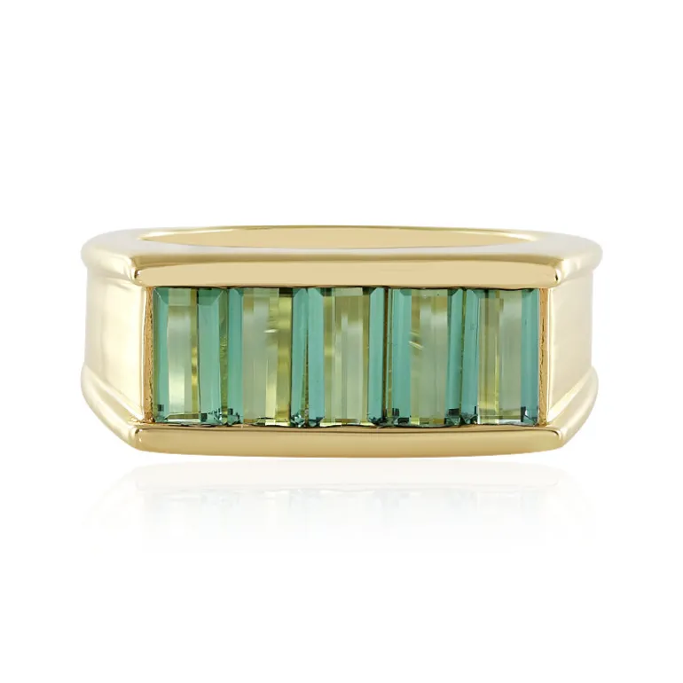 Entdecken Sie die Anziehungskraft dieses exquisiten Rings aus vergoldetem 925er Sterlingsilber, der ein Quintett aus brasilianischen grünen Turmalinen mit einem Gesamtkaratgewicht von 1,594 ct präsentiert. Die Steine im Baguetteschliff reihen sich nahtlos aneinander und bilden ein modernes geometrisches Muster an Ihrem Finger. Dieser Ring ist perfekt geeignet, um sowohl tagsüber als auch abends einen Hauch von Eleganz zu vermitteln. Er begeistert mit seinem eleganten Design und seinen leuchtenden Grüntönen. Kombinieren Sie ihn mit erdigen Tönen für einen natürlichen Look oder kontrastieren Sie ihn mit kräftigen Schwarztönen für einen glamourösen Abend.