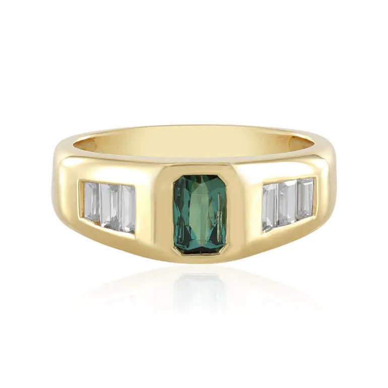 Schmücken Sie Ihren Finger mit der schimmernden Schönheit dieses Rings aus vergoldetem Sterlingsilber, der einen brasilianischen grünen Benedito-Turmalin mit einem Gewicht von 0,479 Karat im Oktagon-Strahlenschliff präsentiert. Flankiert von funkelnden Zirkonen im Baguetteschliff aus Kambodscha, strahlt dieses Schmuckstück mit einem Gesamtkaratgewicht von 1,132 Karat Eleganz aus. Perfekt, um Ihrem Alltag einen Hauch von Raffinesse zu verleihen oder als Statement-Stück für besondere Anlässe.