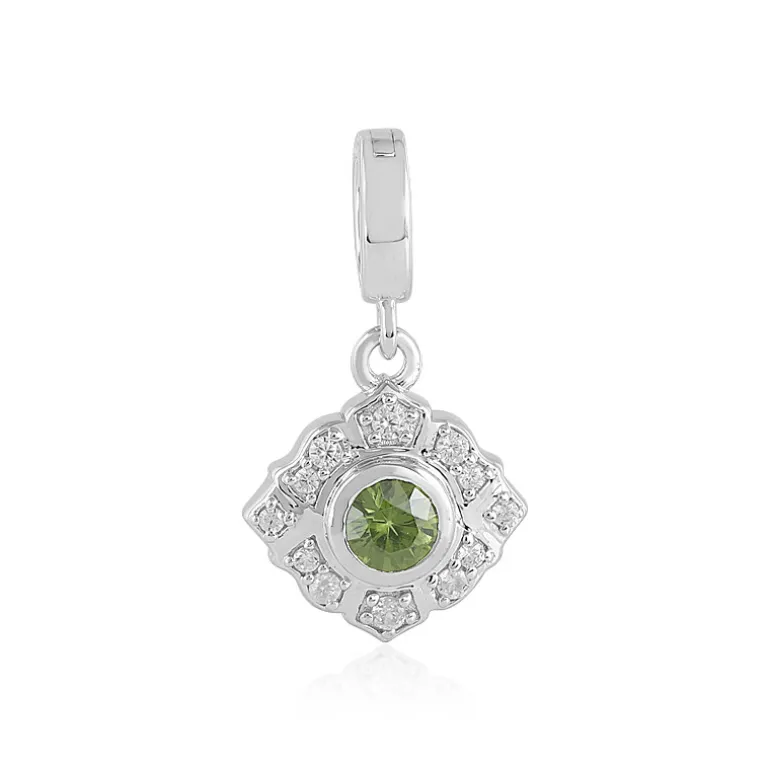 Entdecken Sie die Anziehungskraft dieses bezaubernden Anhängers aus Sterlingsilber, dessen Herzstück ein grüner Ceylon-Zirkon ist, der Sie verzaubert. Der zentrale Edelstein wird von einem funkelnden Halo aus kambodschanischen Zirkon-Akzenten umrahmt, der seinen leuchtend grünen Farbton hervorhebt. Der Anhänger aus platiniertem 925er Sterlingsilber mit einem Gesamtgewicht von 0,533 Karat strahlt einen zeitlosen Charme aus. Seine Steine im Rundschliff strahlen und machen ihn zu einem vielseitigen Schmuckstück, das sich perfekt für ein legeres Outfit oder einen Hauch von Eleganz für die Abendgarderobe eignet. Der mit einem Varioclip versehene Anhänger lässt sich leicht an jeder Kette oder Halskette tragen und wird so zu einem unverzichtbaren Bestandteil Ihrer Schmucksammlung.