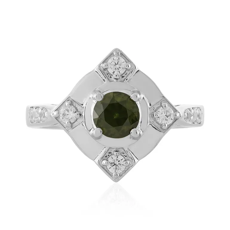 Entdecken Sie die Faszination dieses fein gearbeiteten Rings mit einem glänzenden grünen Zirkon von 0,548 Karat aus den sagenumwobenen Minen von Ceylon, Sri Lanka. Jeder der sechs kambodschanischen Zirkone, insgesamt 0,313ct, ist fachmännisch geschliffen, um das Herzstück zu ergänzen. Das Band aus 925er Sterlingsilber, das mit einer hochwertigen Platinbeschichtung versehen ist, verleiht diesem eleganten Schmuckstück Haltbarkeit und zusätzlichen Glanz. Dieser Ring eignet sich sowohl für legere Eleganz als auch für formelle Anlässe und ist eine zeitlose Ergänzung für jede Schmucksammlung.