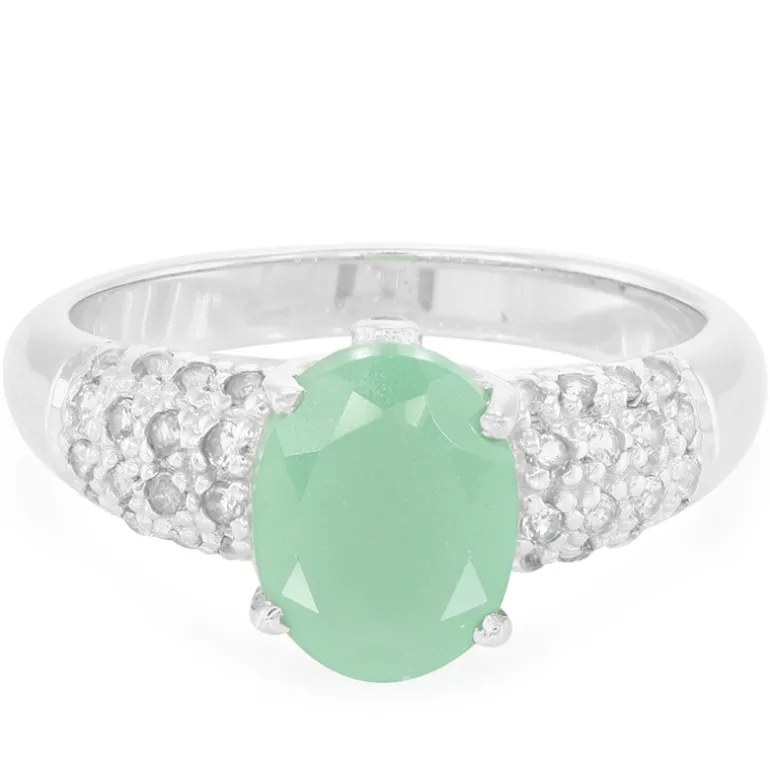 Entdecken Sie die erfrischende Schönheit dieses Rings aus brasilianischem grünem Chalcedon, gekrönt von einem ovalen Edelstein von 1,73 Karat. Eingebettet in 925er Sterlingsilber, fängt der Ring das Licht mit seinem Heiligenschein aus 34 funkelnden weißen Topasen ein, was seinen Reiz noch verstärkt. Bei einem ungefähren Silbergewicht von 3,13 g beläuft sich das Gesamtkaratgewicht auf 2,037 ct. Dieser Ring eignet sich perfekt, um Ihrer Garderobe einen Hauch von ruhigem Grün zu verleihen, und ist ideal für die Eleganz des Alltags oder einen besonderen Abend.