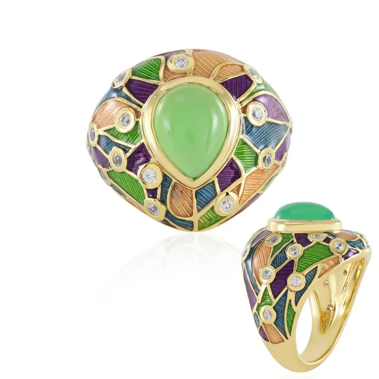 Genießen Sie die üppige grüne Ruhe dieses exquisiten tropfenförmigen Cabochons aus brasilianischem grünem Chalcedon mit 2,7 Karat, der elegant in vergoldetem 925er Sterling Silber gefasst ist. Der zentrale Edelstein ist von 16 funkelnden Zirkonen aus Kambodscha mit einem Gesamtgewicht von 0,259 ct umgeben, die die filigranen Emaille-Details des Rings betonen. Mit einem Gesamtgewicht von 2,959 ct ist dieses kunstvolle Schmuckstück nicht nur für den Alltag geeignet, sondern auch ein ideales Accessoire für besondere Anlässe oder für einen Hauch von Glamour im Alltag.