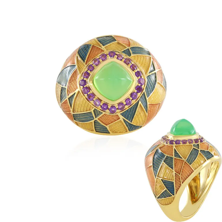 Entdecken Sie die Eleganz der Natur mit diesem vergoldeten Ring aus Sterlingsilber, der einen leuchtenden 2,7-karätigen brasilianischen grünen Chalcedon im einzigartigen Zuckerhut-Schliff präsentiert, der von zierlichen 0,324-karätigen Amethysten umgeben ist. Die verspielte geometrische Emaillearbeit verleiht ihm einen Hauch von Art-Déco-Charme, perfekt für Cocktailpartys oder einen opulenten Brunch. Tragen Sie diesen Gesprächsanlasser als raffinierten Farbtupfer zum klassischen kleinen Schwarzen oder als Ergänzung zu einem Ensemble in Erdtönen.