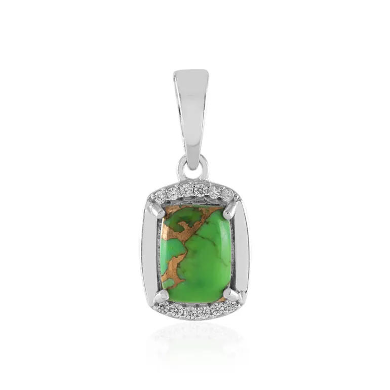 Dieser bezaubernde Anhänger zeigt einen atemberaubenden grünen Kingman-Mohave-Türkis (0,99 Karat) aus den USA, der von funkelnden kambodschanischen Zirkonsteinen (0,065 Karat) akzentuiert wird. Die leuchtenden Grüntöne und die natürlichen Muster des Edelsteins werden durch den Glanz des 925er Sterlingsilbers wunderbar umrahmt. Mit seiner perfekten Mischung aus Vintage-Charme und moderner Eleganz wertet dieses Schmuckstück jedes Outfit auf und setzt sowohl bei zwanglosen Zusammenkünften als auch bei formellen Anlässen ein Statement.