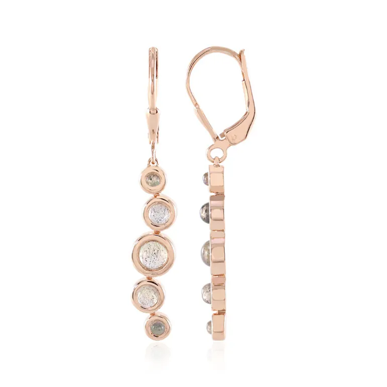 Entdecken Sie den bezaubernden Schimmer unserer Ohrringe aus grünem Maniry-Labradorit mit Rosévergoldung, ein Signature-Stück von KM für Juwelo. Aus 925er Sterlingsilber gefertigt und mit einer zarten Rosévergoldung überzogen, beherbergen diese Ohrringe eine Kaskade grüner Maniry-Labradorit-Cabochons von insgesamt 1,35 Karat von der exotischen Insel Madagaskar. Die abwechselnden Größen erzeugen einen sanften Farbverlauf, der in einer Länge von 41 mm gipfelt. Sie eignen sich sowohl für legere Ausflüge als auch für elegante Abendveranstaltungen und verleihen Ihrer Kleidung einen Hauch von verspielter Eleganz.