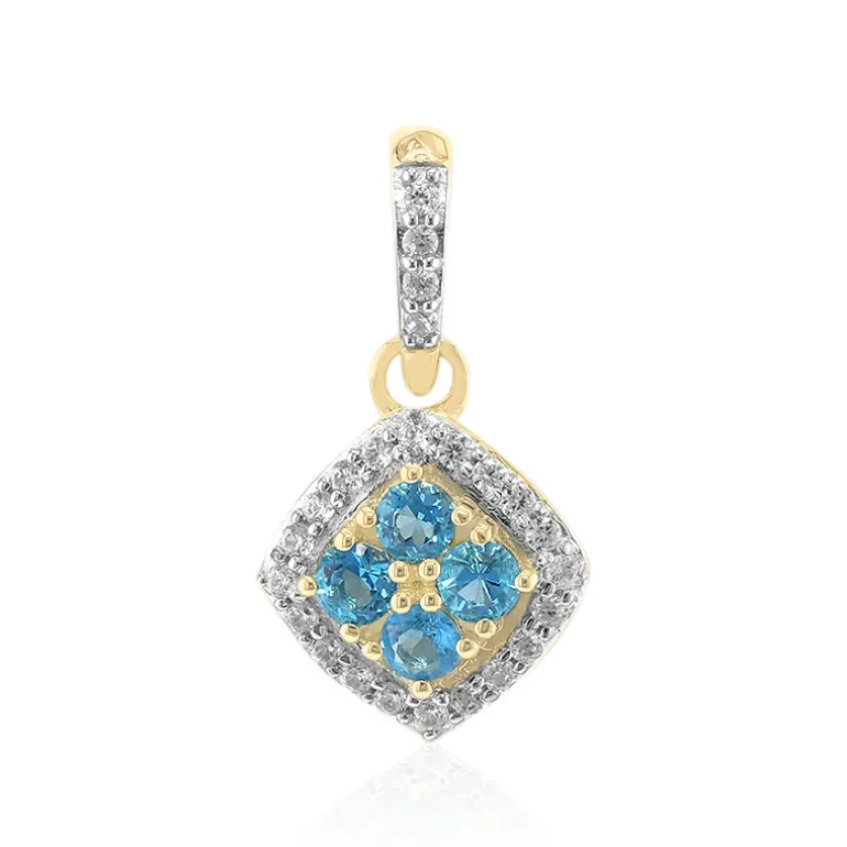 Dieser bezaubernde Anhänger glänzt mit einer Reihe von vier bezaubernden Haüyne-Edelsteinen aus Deutschland mit einem Gesamtgewicht von 0,17 ct, umgeben vom Funkeln von 24 tansanischen Zirkonen mit einem Gesamtgewicht von 0,147 ct. Der Anhänger ist in 375er 9K Gelbgold gefasst und hat ein Gesamtgewicht von 0,317ct. Das elegante Design in Form eines Diamanten misst 17×9,5 mm und macht ihn zu einem raffinierten Schmuckstück. Er ist ideal, um einem formellen Outfit einen Farbakzent zu verleihen oder Ihren Alltagsstil aufzuwerten.