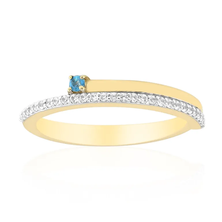 Entdecken Sie die Anziehungskraft dieses raffinierten Rings mit einem leuchtenden deutschen Haüyn-Stein in einer Fassung aus 9-karätigem Gelbgold. Umgeben von funkelnden Zirkonen aus Tansania, wiegt dieses Schmuckstück insgesamt 0,193 Karat und wurde entworfen, um die Essenz der Eleganz einzufangen. Das schlichte Design macht ihn zu einer vielseitigen Ergänzung sowohl für legere als auch für formelle Anlässe. Stellen Sie sich diesen exquisiten Ring als letzten Schliff für Ihren Abendlook oder als subtilen Hauch von Luxus in Ihrer Alltagsgarderobe vor.