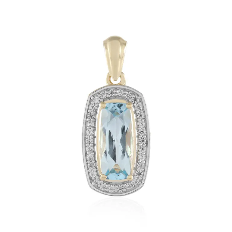Dieser exquisite Anhänger zeigt einen himmelblauen Topas von 1,71 Karat aus Brasilien, der fachmännisch in eine antike Form geschliffen wurde. Der Topas ist von 30 kambodschanischen Zirkonen umgeben, die ihm ein brillantes Funkeln verleihen. Der aus 9 Karat Gold gefertigte Anhänger ist elegant und raffiniert zugleich. Perfekt, um Ihren Alltagslook aufzuwerten oder einem besonderen Anlass einen Hauch von Klasse zu verleihen. Kombinieren Sie ihn mit einem schicken Kleid oder einer maßgeschneiderten Bluse.