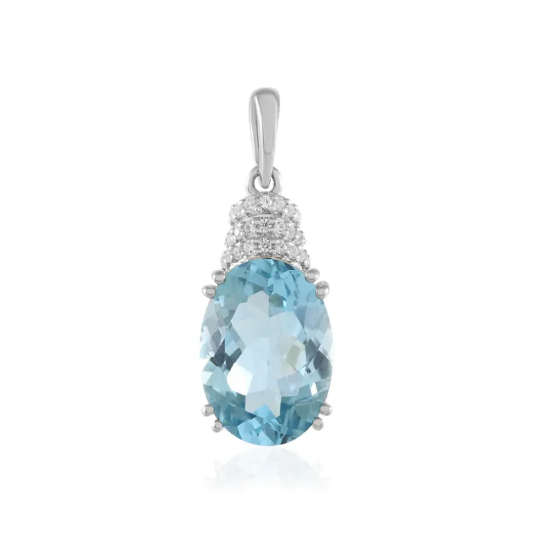 Dieser exquisite Anhänger zeigt einen atemberaubenden himmelblauen Topas aus Brasilien, der im eleganten Ovalschliff das Licht einfängt und von funkelnden Zirkonakzenten umgeben ist. Der Anhänger ist aus platiniertem 925er Sterlingsilber gefertigt und strahlt Raffinesse und Charme aus. Dieser Anhänger ist ein Muss für jede Schmucksammlung und eignet sich perfekt, um die Alltagskleidung aufzuwerten oder der Abendgarderobe einen Hauch von Eleganz zu verleihen.