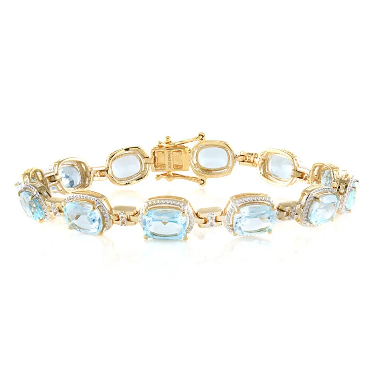 Entdecken Sie die Raffinesse dieses Armbands mit himmelblauen Topasen aus vergoldetem 925er Sterlingsilber. Mit 12 antiken Topasen im Kissenschliff aus Brasilien, die mit weißen indischen Topasen akzentuiert sind, bildet es ein atemberaubendes Ensemble. Dieses Armband eignet sich perfekt für Abendveranstaltungen oder als Statement-Stück zur Bürokleidung und bietet eine harmonische Mischung aus Eleganz und Stil.