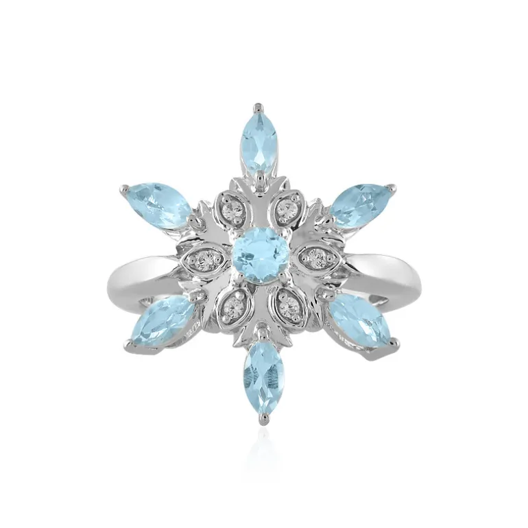 Tauchen Sie ein in eine Welt der Gelassenheit mit diesem bezaubernden himmelblauen Topasring. Die in einem harmonischen Blumenmuster angeordneten Topase im Marquiseschliff sind kunstvoll in platiniertes Sterlingsilber gefasst, das für zusätzlichen Glanz sorgt. Der zentrale Edelstein mit seinem einladenden Rundschliff setzt einen exquisiten Akzent in diesem Design. Ein Hauch von kambodschanischem Zirkon ergänzt das Blau, das an einen klaren Himmel erinnert. Dieser Ring mit einem Gewicht von ca. 3,99 g ist ideal, um sowohl Tages- als auch Abendgarderobe einen Hauch von Eleganz zu verleihen.
