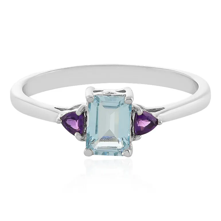 Entdecken Sie die Faszination kontrastreicher Farbtöne mit diesem Ring aus Sterlingsilber. Er präsentiert einen faszinierenden 1,144 ct himmelblauen Topas aus Madagaskar, der in einer raffinierten Achteckform geschliffen ist und von zwei lebhaften brasilianischen Amethysten von insgesamt 0,188 ct flankiert wird. Dieser Ring ist mit Platin überzogen, was ihm zusätzlichen Glanz und Langlebigkeit verleiht. Er ist sowohl eine zarte Ergänzung für den Alltag als auch ein auffälliges Schmuckstück für besondere Anlässe. Das ruhige Blau und das leuchtende Violett vervollständigen Ihr Ensemble. Der Ring hat die perfekte Größe von 23 x 19 mm.